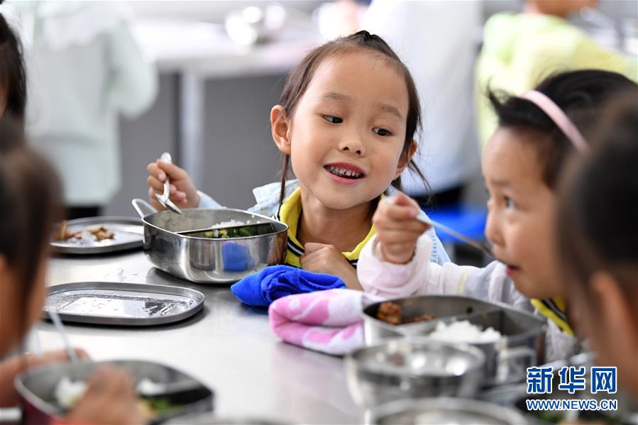 9月3日,金寨縣希望小學(xué)學(xué)生在吃午餐。新華社記者張端攝