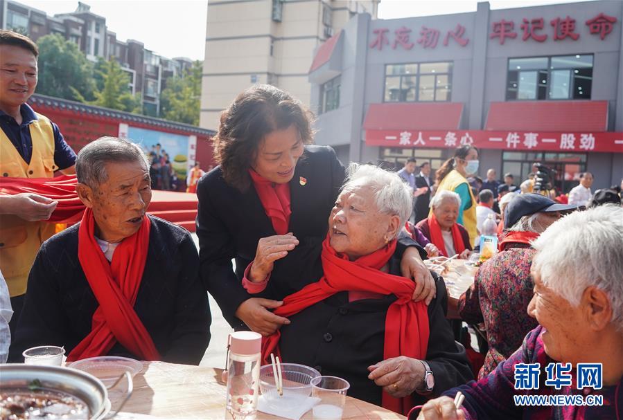 11月2日,南京仙林街道黨工委書記孫金娣(前左二)在千家宴上給老人們戴上圍巾,送上祝福。 新華社記者 季春鵬 攝