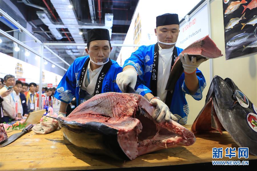 11月7日,來(lái)自日本長(zhǎng)崎魚(yú)市株式會(huì)社的專(zhuān)業(yè)切魚(yú)師傅在現(xiàn)場(chǎng)解體70公斤藍(lán)鰭金槍魚(yú)。第二屆中國(guó)國(guó)際進(jìn)口博覽會(huì)正在上海國(guó)家會(huì)展中心舉行。博覽會(huì)的食品及農(nóng)產(chǎn)品展區(qū)里匯集了來(lái)自世界各地的美食,同時(shí)也上演各種精彩美食秀。11月7日,來(lái)自日本長(zhǎng)崎魚(yú)市株式會(huì)社的專(zhuān)業(yè)切魚(yú)師傅現(xiàn)場(chǎng)解體一條70公斤的藍(lán)鰭金槍魚(yú),吸引大量參觀者觀看、品嘗。新華社記者隋先凱攝