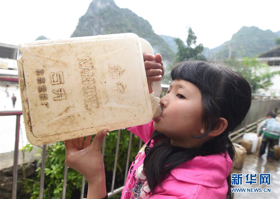 在廣西大化瑤族自治縣板升鄉(xiāng)八好小學(xué),一名學(xué)生喝水桶里的雨水(2014年11月24日攝)。八好小學(xué)有400多名學(xué)生,曾僅有一個(gè)不足100立方米的水柜,用于收集儲(chǔ)存樓頂?shù)挠晁瑢W(xué)生需定期定量用水。遇到長時(shí)間不下雨,學(xué)校需要到鄉(xiāng)政府所在地運(yùn)水。如今,學(xué)校修建了5個(gè)大水柜,并從兩公里外引泉水到校園,飲水難問題得到解決。新華社記者黃孝邦攝