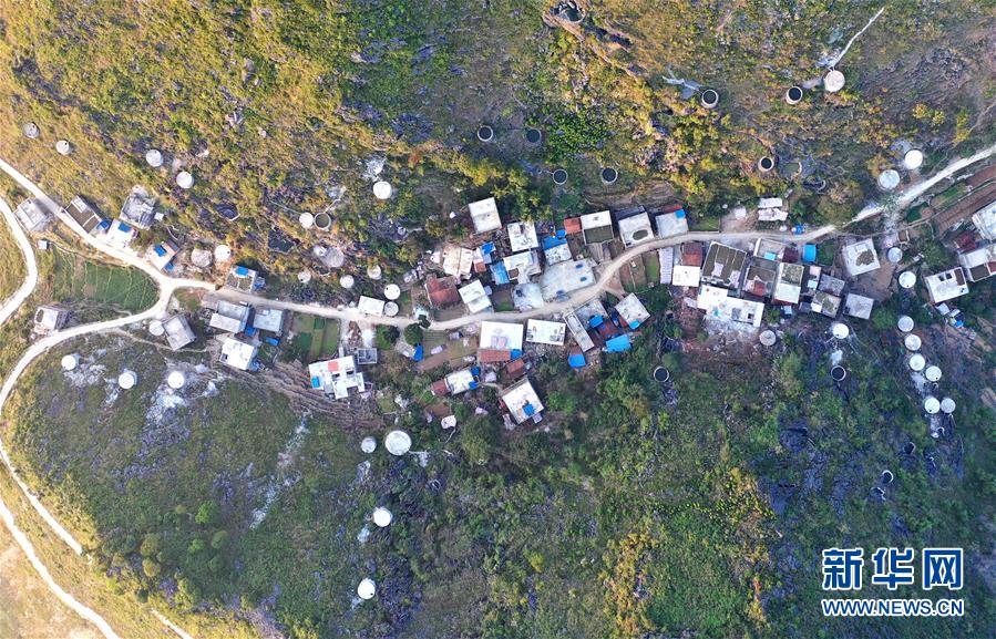 廣西大化瑤族自治縣七百弄鄉(xiāng)弄騰村群眾的家庭水柜分布在房前屋后(11月9日無人機(jī)拍攝)。新華社記者黃孝邦攝