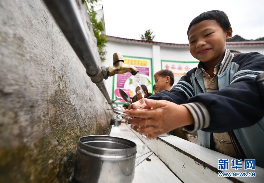 在廣西大化瑤族自治縣板升鄉(xiāng)八好小學(xué),同學(xué)們在用自來水洗餐具(11月13日攝)。新華社記者黃孝邦攝