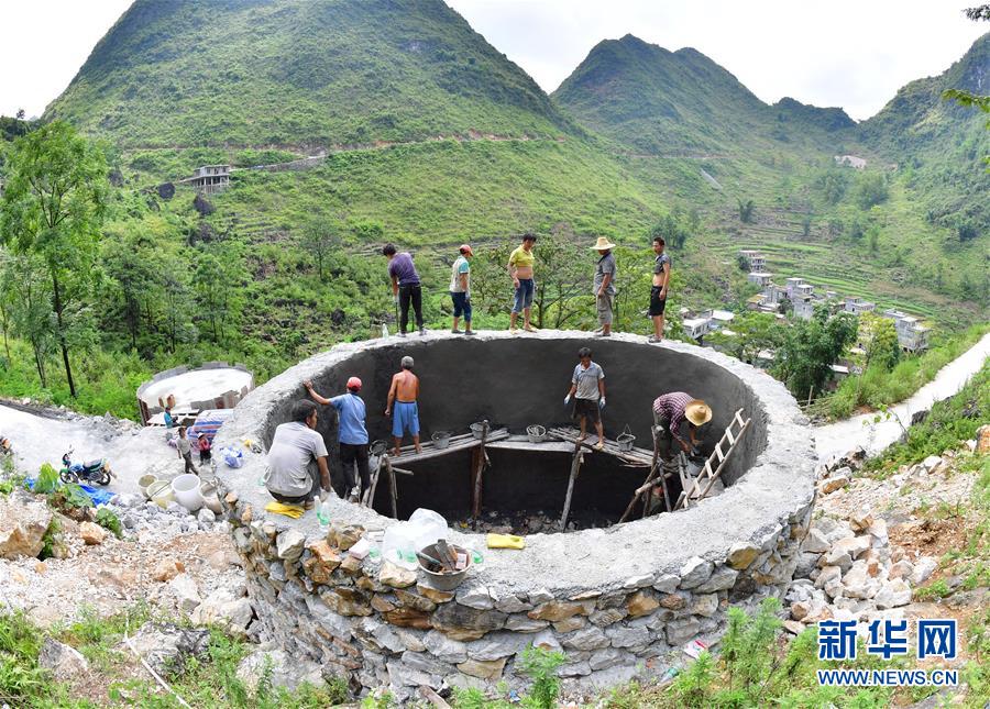 在廣西大化瑤族自治縣板升鄉(xiāng)弄勇村,群眾在修建家庭水柜(2017年9月2日攝)。新華社記者黃孝邦攝