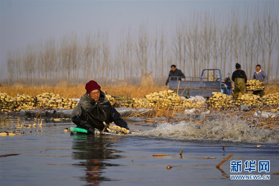 11月18日,工人在采收蓮藕。初冬時節(jié),河北省唐山市曹妃甸蓮藕豐收,工人們在結冰之前忙著采收蓮藕。新華社記者楊世堯攝