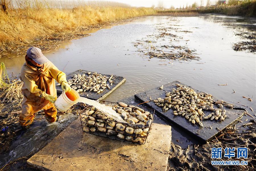 11月18日,工人在采收蓮藕。初冬時(shí)節(jié),河北省唐山市曹妃甸蓮藕豐收,工人們?cè)诮Y(jié)冰之前忙著采收蓮藕。新華社記者楊世堯攝
