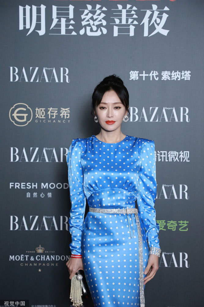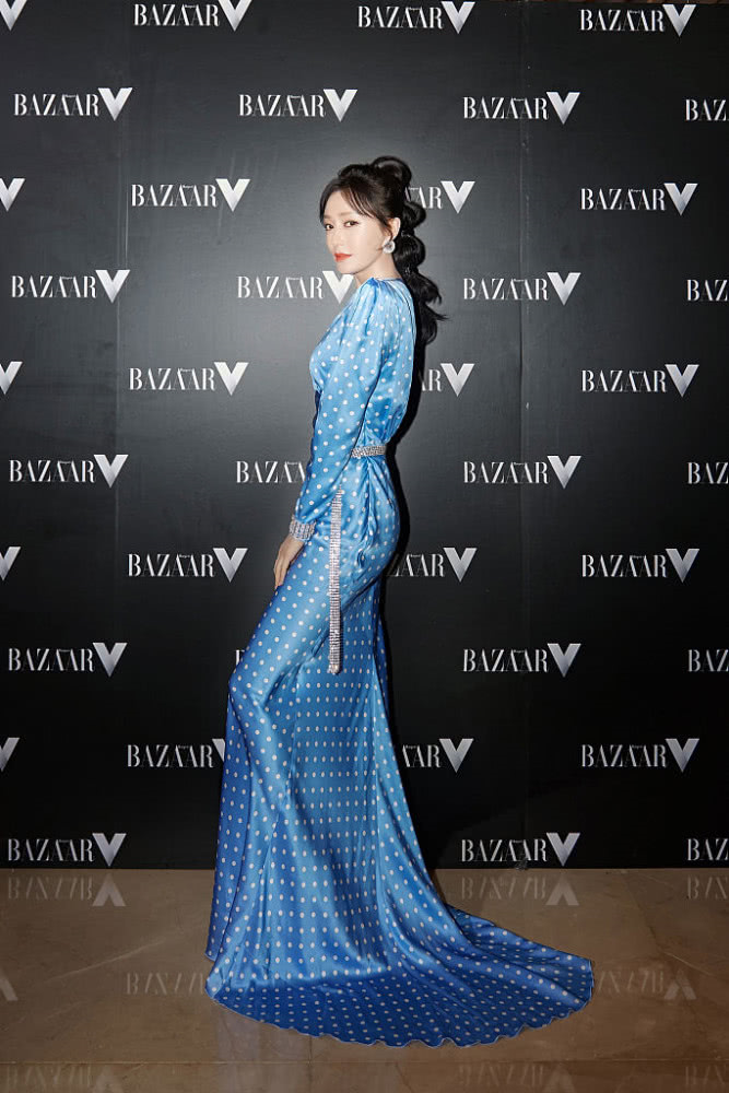 秦嵐穿波點(diǎn)藍(lán)裙身姿婀娜,靈動飄逸似美人魚。