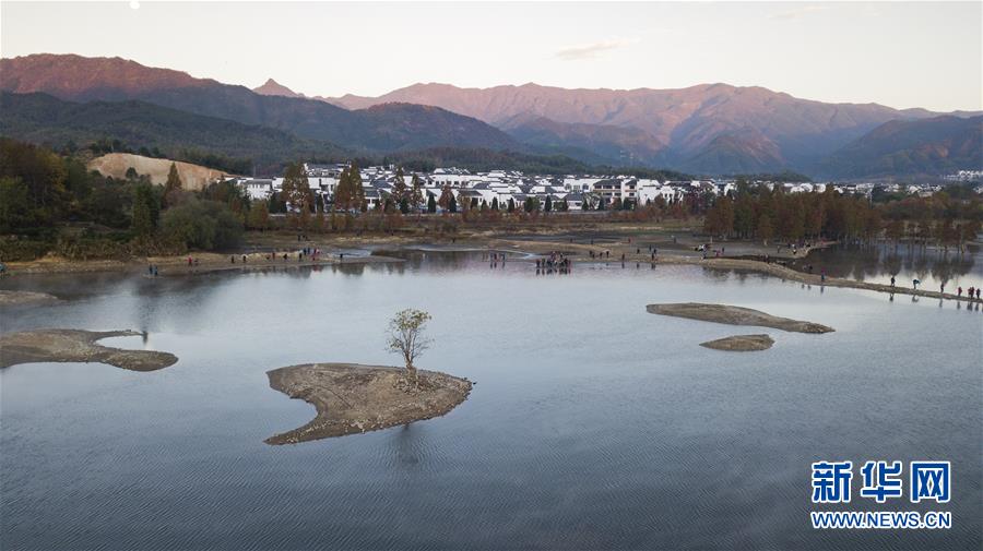 這是11月14日無人機拍攝的安徽黟縣奇墅湖晨景。新華社記者韓曉雨攝