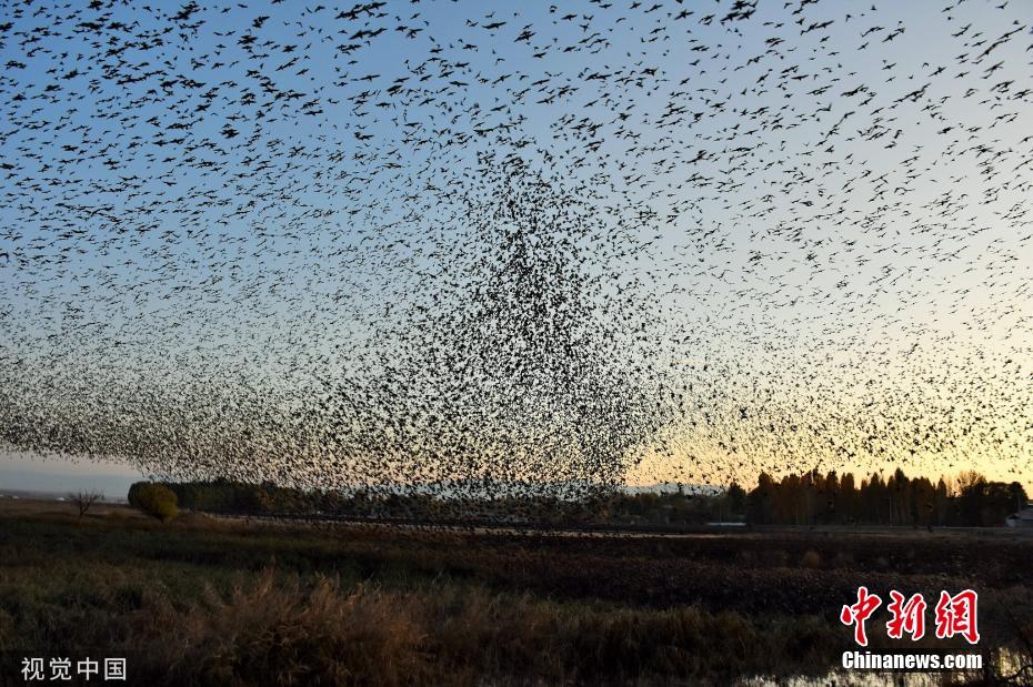 近日,土耳其穆什,椋鳥群遷徙途中,黑壓壓一片遮擋天空。圖片來源:視覺中國