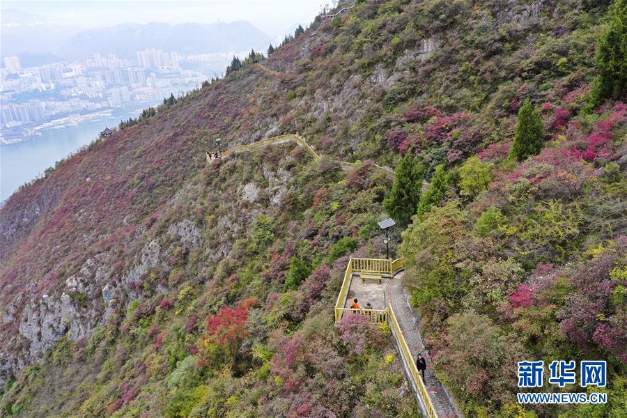 11月23日,游客在位于長江巫峽段的巫山文峰景區(qū)游覽(無人機(jī)拍攝)。初冬時節(jié),位于重慶巫山縣境內(nèi)的長江巫峽段呈現(xiàn)出一江碧水東流、兩岸層林盡染的秀美景象。新華社記者王全超攝