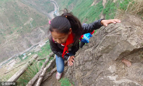 四川省涼山彝族自治州昭覺(jué)縣支爾莫鄉(xiāng)阿土勒爾村,是一座名副其實(shí)的“懸崖村”,72戶人家居住在這里,處于美姑河大峽谷斷坎巖肩斜臺(tái)地,海拔1400多米,與地面垂直距離約800米。5月14日,放學(xué)路上,孩子們?cè)谂逝捞偬?。圖片來(lái)源:視覺(jué)中國(guó)