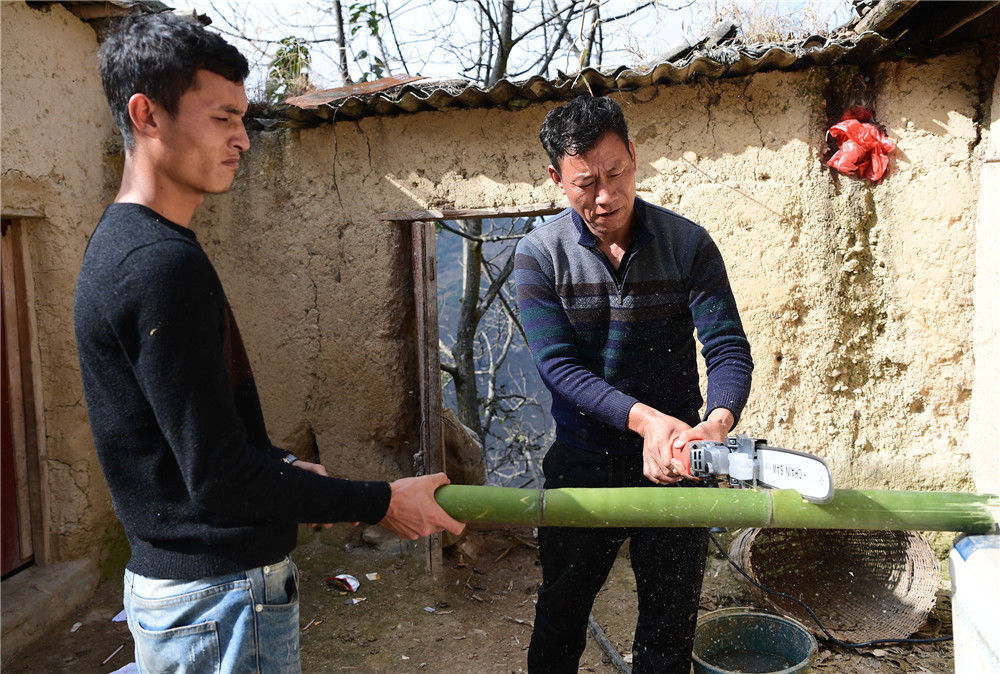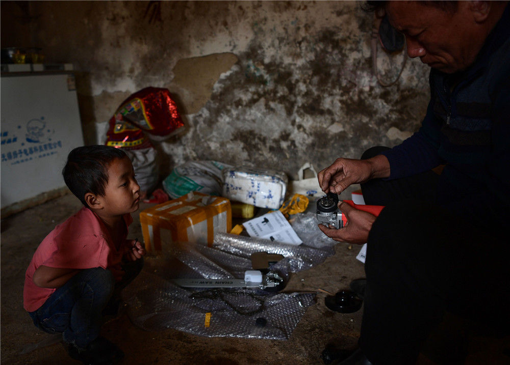 2019年11月16日,四川涼山,楊陽(yáng)的父親某色蘇拉澤正在安裝電鋸。