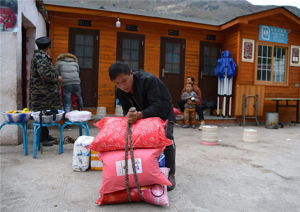 2019年11月16日,四川涼山,背著快遞包裹回家,成為懸崖村天梯上的新風(fēng)景。
