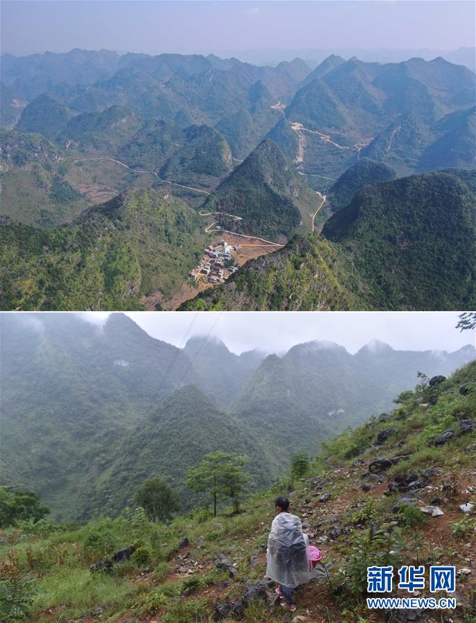 拼版照片:上圖為已經(jīng)修通水泥路的大化瑤族自治縣板升鄉(xiāng)八好村八好屯(11月11日無(wú)人機(jī)拍攝);下圖為在尚未通路的八好村八好屯,村民背著化肥走山路回家(2016年4月15日攝)。新華社記者黃孝邦攝