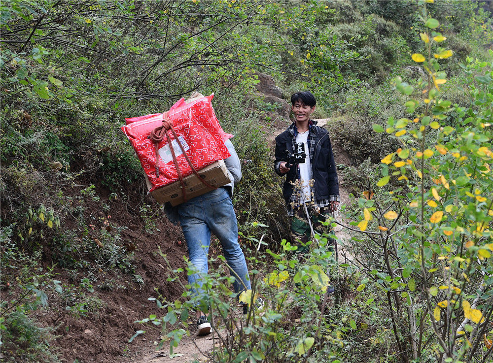 2019年11月16日,四川涼山,楊陽(yáng)背包裹回家的路上遇見(jiàn)村里正在做直播的年輕人。