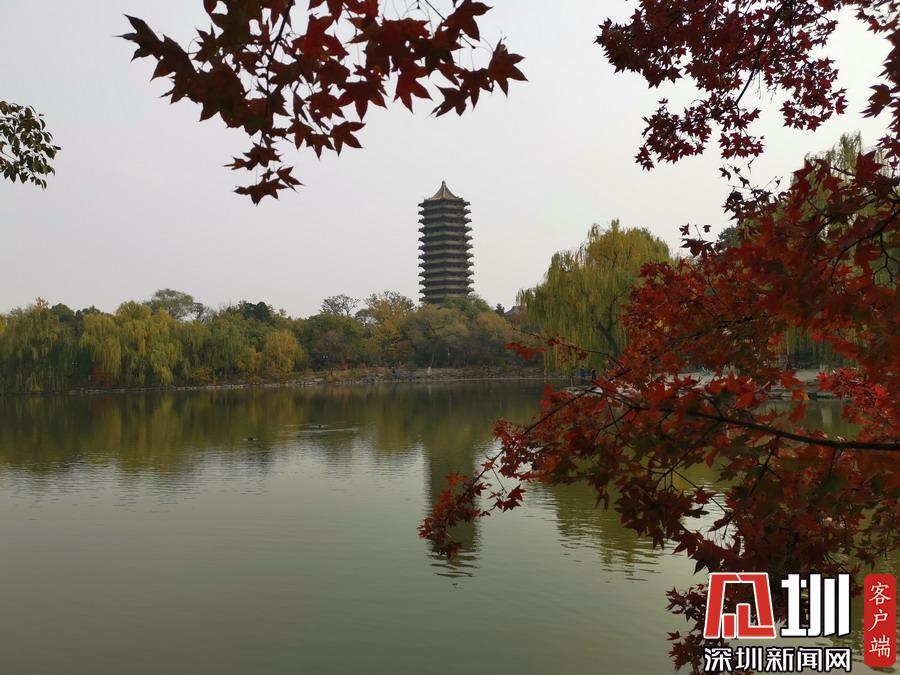未名湖畔紅葉多姿、美麗寧靜。