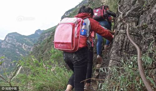 上學(xué)的孩子都背著沉沉的書包,大多數(shù)是女孩,15個(gè)孩子在三個(gè)家長(zhǎng)的保護(hù)下,大約用了2個(gè)小時(shí),到達(dá)“懸崖村”。上山容易下山難,遇到雨雪天氣,村里人就不再外出了。圖片來源:視覺中國(guó)