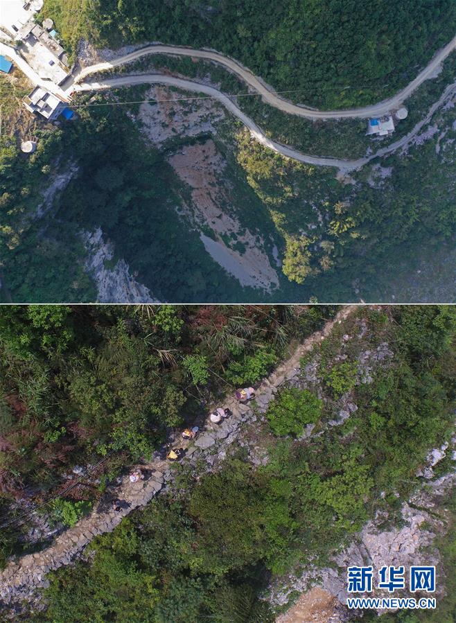 拼版照片:上圖為已經(jīng)修通水泥路的大化瑤族自治縣板升鄉(xiāng)八好村八好屯(11月11日無(wú)人機(jī)拍攝);下圖為在尚未通路的八好村八好屯,村民背著化肥走山路回家(2016年4月15日攝)。新華社記者黃孝邦攝