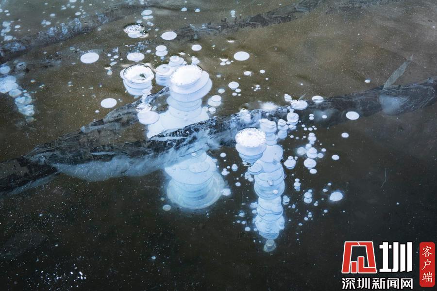 2019年11月26日,黑龍江漠河觀音山景區(qū)出現(xiàn)“冰泡”奇觀。透過(guò)晶瑩剔透的冰面,可以看到一串串潔白氣泡分布在冰層中。
