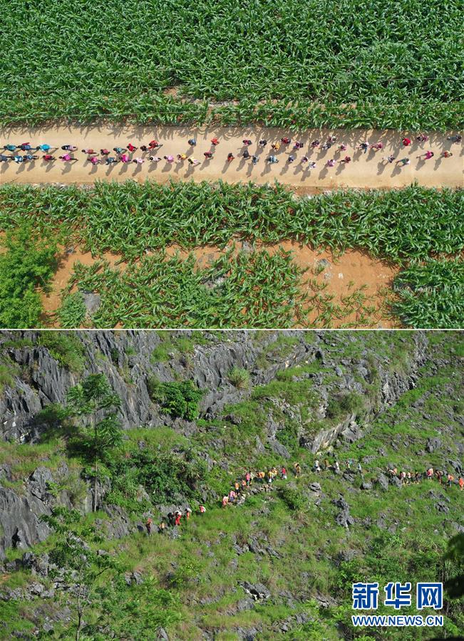 拼版照片:上圖為在大化瑤族自治縣板升鄉(xiāng)弄勇村,孩子們走在放學(xué)路上(5月10日無人機(jī)拍攝);下圖為在弄勇村弄頂屯,孩子們扛著生活用具,走山路回家(2012年7月4日攝)。新華社記者黃孝邦攝
