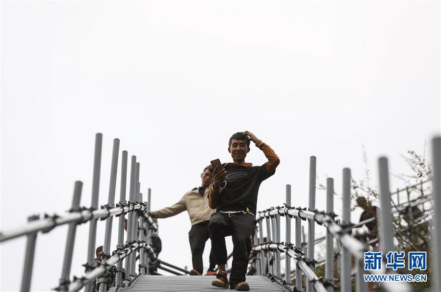 阿土列爾村彝族小伙莫色爾伍(右)在鋼梯上行走(11月23日攝)。新華社記者江宏景攝
