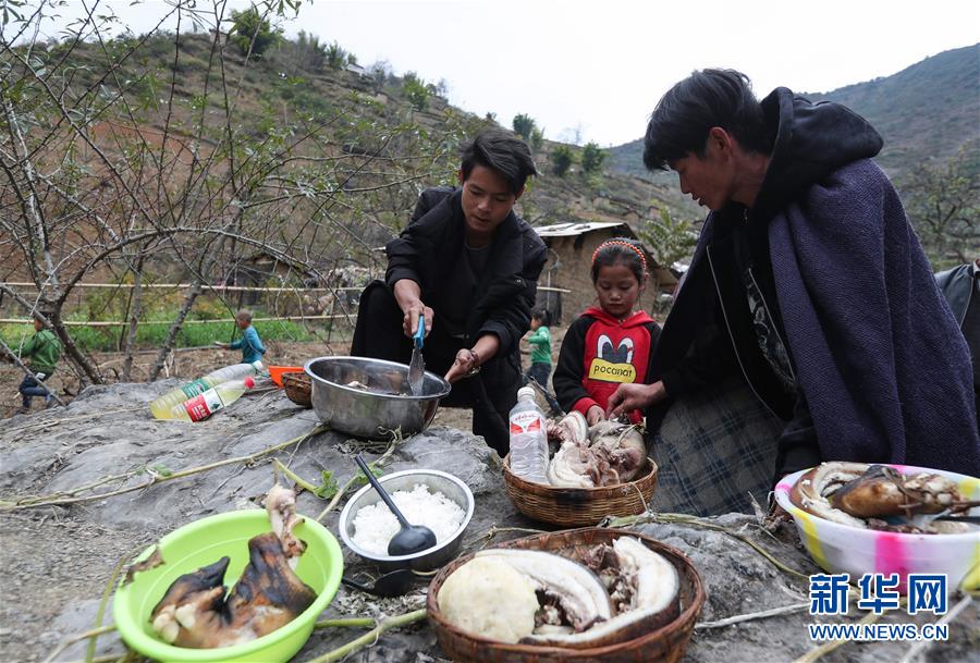 11月24日,在昭覺縣支爾莫鄉(xiāng)阿土列爾村,俄底曲正(左)和阿牛(右)在準(zhǔn)備祭祀用的豬肉和羊肉等食物。新華社記者江宏景攝