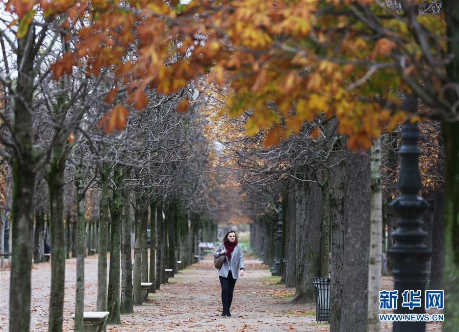 11月26日,在法國巴黎,一名女子走在杜勒里花園的林蔭道上。新華社記者高靜攝