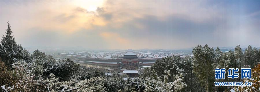 這是11月30日在北京景山公園萬(wàn)春亭拍攝的雪后故宮(手機(jī)全景模式拍攝)。 新華社記者 沈伯韓 攝