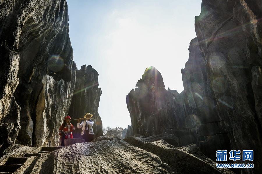 當(dāng)?shù)厣贁?shù)民族樂手在石林景區(qū)演奏民族音樂(11月27日攝)。新華社記者蘭紅光攝