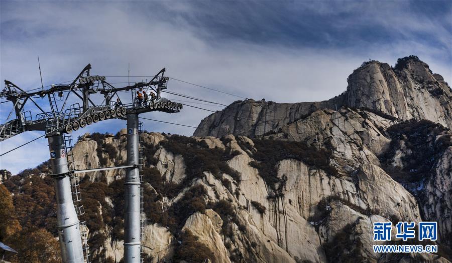 華山太華索道維修人員對(duì)索道支架及鋼絲繩進(jìn)行檢測(cè)(12月6日攝)。新華社記者陶明攝