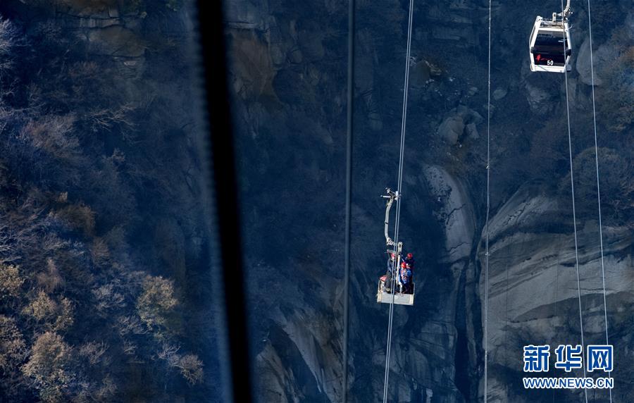 華山太華索道檢修人員在進(jìn)行承載索調(diào)試(12月6日攝)。新華社記者陶明攝
