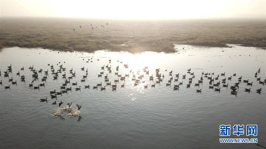 12月7日,一群候鳥在升金湖停留(無人機拍攝)。新華社記者張端攝