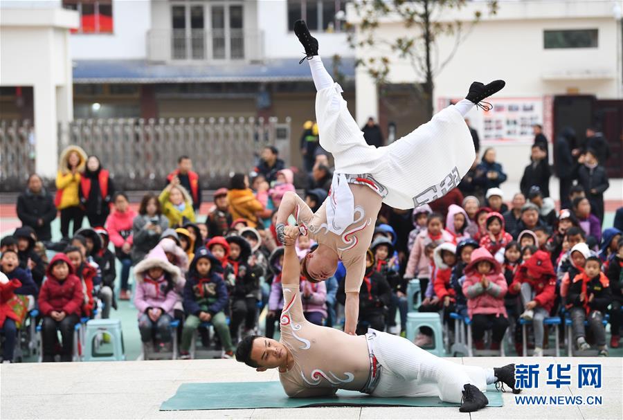 12月12日,文藝志愿者在中益鄉(xiāng)小學(xué)表演雜技《中國力量》。