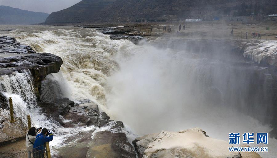 12月14日,游人在壺口瀑布景區(qū)拍照(無人機(jī)拍攝)。 新華社記者 陶明 攝
