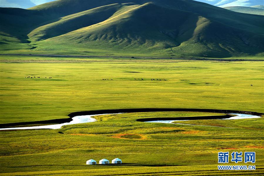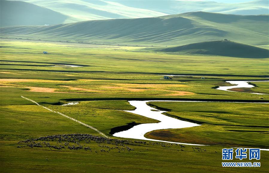 8月29日無人機(jī)拍攝的內(nèi)蒙古呼倫貝爾市陳巴爾虎旗境內(nèi)的莫日格勒河與羊群。新華社記者李京攝