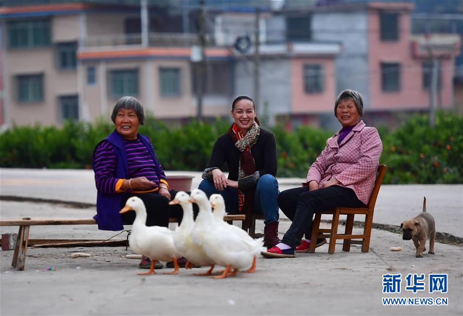 在鹿寨縣拉溝鄉(xiāng)木龍村,李柳萍(右二)在回村采購?fù)撂禺a(chǎn)途中和老人們交流(12月14日攝)。新華社記者黃孝邦攝