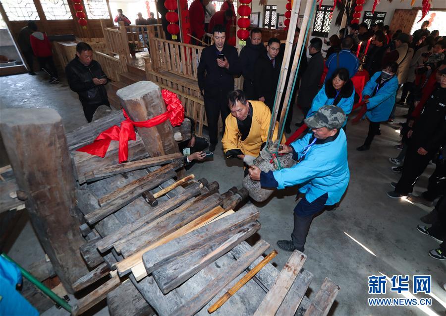 12月15日,工作人員在老油坊內通過撞擊的方式將不同尺寸的木楔插入木龍,進而榨出茶餅中的茶油。 新華社記者 徐昱 攝
