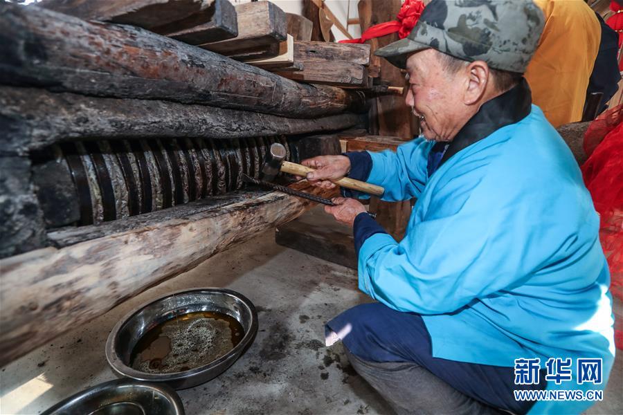 12月15日,老油坊的木龍中經(jīng)過(guò)壓榨的茶餅開始出油。 新華社記者 徐昱 攝