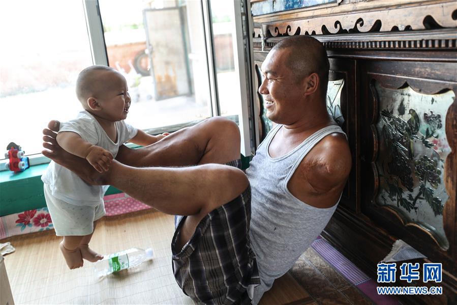 8月8日,王剛與兒子“肉肉”在家中玩耍。33歲的王剛來自遼寧省鐵嶺市昌圖縣兩家子鎮(zhèn)河西村。作為父親,王剛雖然沒有堅(jiān)實(shí)的臂膀去擁抱自己的孩子,但他一直努力用自己的方式呵護(hù)照顧家人?!盁o臂爸爸”的父愛給很多人帶來了力量和鼓舞,被人親切地稱為“最強(qiáng)爸爸”。新華社記者潘昱龍攝