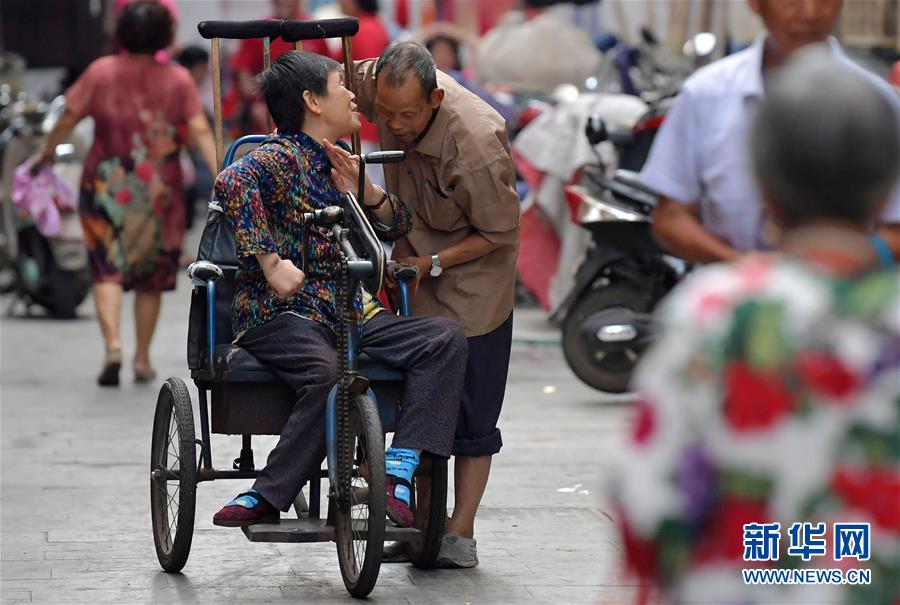 葉文娟在熊金根耳邊交代要買的東西(10月2日攝)。江西省南昌市西湖區(qū)繩金塔社區(qū)有一對(duì)特殊的夫妻,74歲的丈夫熊金根聽力殘疾,67歲的妻子葉文娟患小兒麻痹癥后行動(dòng)不便。夫妻二人相互照顧相濡以沫度過了30余年。新華社記者彭昭之?dāng)z