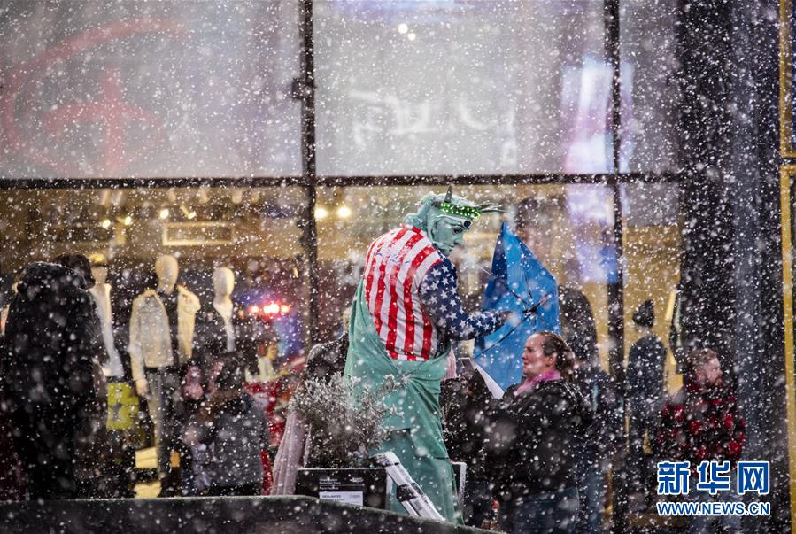 12月18日,在美國紐約時報廣場,一名打扮成“自由女神像”的街頭表演者在雪中等待生意。新華社記者 王迎 攝