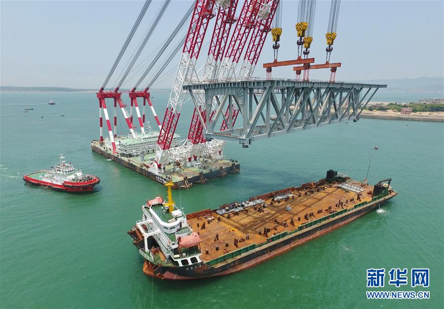 5月12日,“大橋海鷗號(hào)”起重船在吊裝一孔簡(jiǎn)支鋼桁梁(無(wú)人機(jī)拍攝)。新華社記者林善傳攝