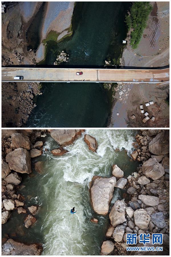 拼版照片:上圖為貴州省威寧縣海拉鎮(zhèn)海元村“溜索改橋”后的場(chǎng)景(2018年3月12日無(wú)人機(jī)拍攝);下圖為貴州省威寧縣海拉鎮(zhèn)花果村的村民利用尚未拆除的溜索過江(2018年3月12日無(wú)人機(jī)拍攝)。