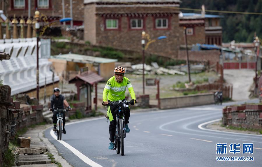 6月25日,在川藏公路沿線的雅江縣剪子彎山下相格宗村布珠民居客棧,55歲的布珠(左)幫一名騎摩托車的游客推車。新華社記者江宏景攝