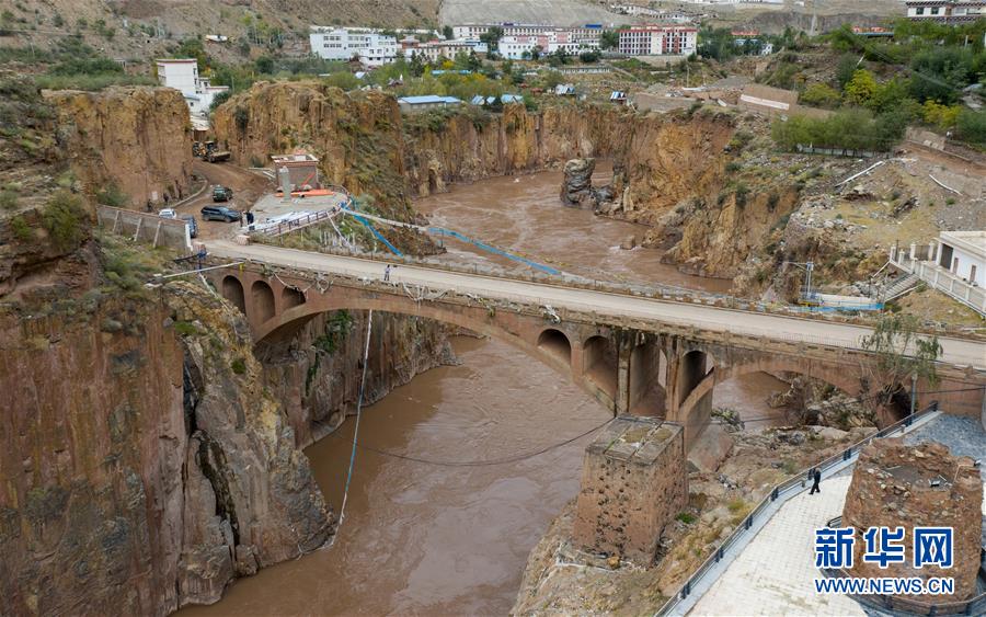 在西藏八宿的怒江大橋旁矗立著一座橋墩(10月23日攝)。據(jù)十八軍后人介紹,工兵5團一位戰(zhàn)士修橋時過于疲憊,不慎掉入了正在澆注的橋墩中,成了永遠(yuǎn)的紀(jì)念碑。新華社記者江宏景攝