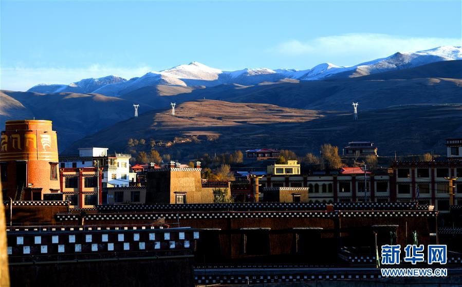 川藏線四川甘孜縣境內(nèi)的雪山、白塔和民居(11月3日攝)。新華社記者陳天湖攝