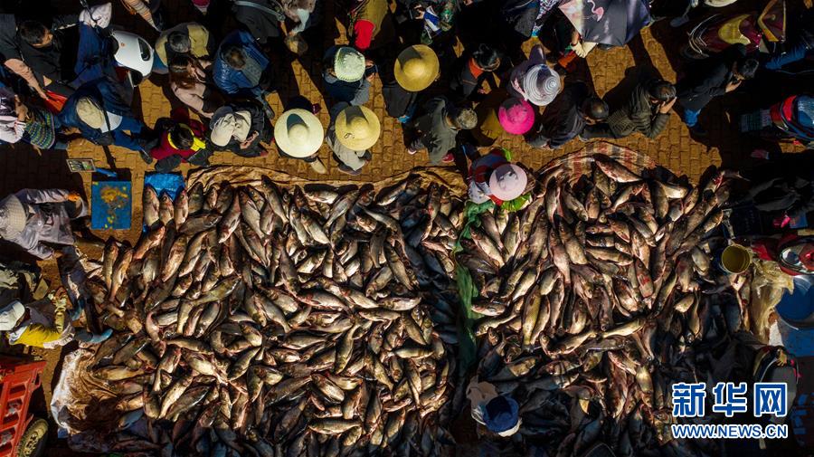 12月25日,人們?cè)谛窃坪系睦虾泳佐~市選購(gòu)剛捕撈的鮮魚(無(wú)人機(jī)拍攝)。新華社記者胡超攝