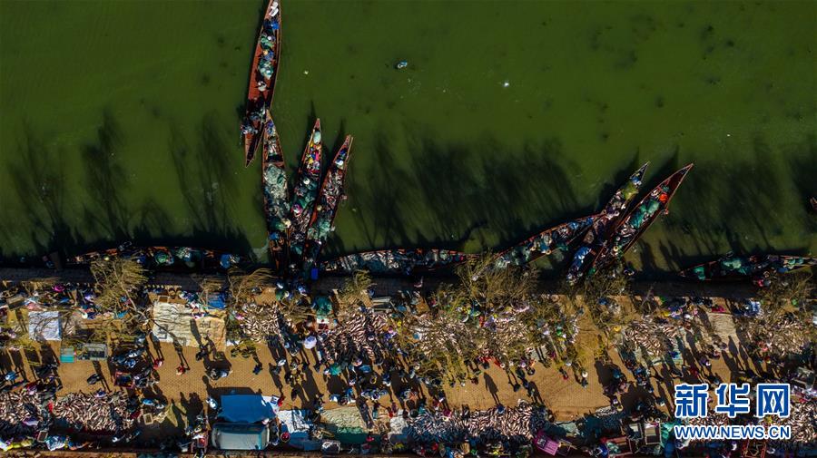 星云湖畔的老河咀魚市熱鬧非凡(12月25日無人機拍攝)。新華社記者胡超攝