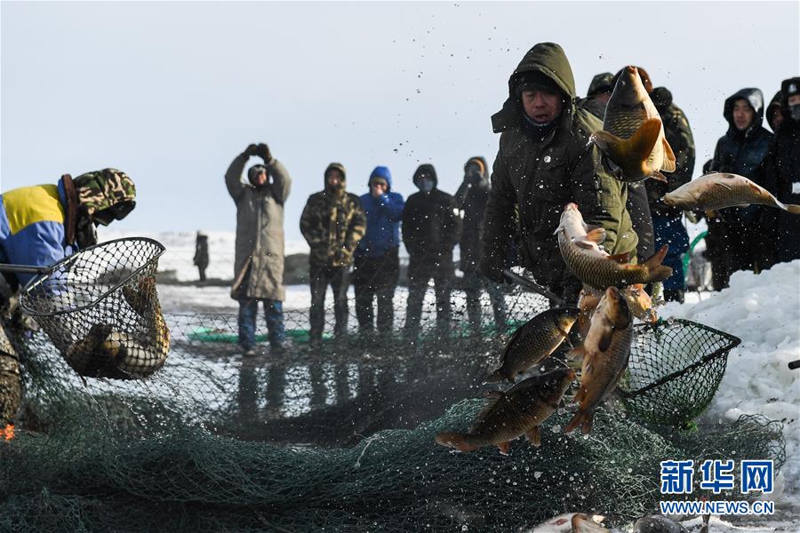 12月18日,工作人員將冬捕魚(yú)打撈上岸。當(dāng)日,位于內(nèi)蒙古呼倫貝爾大草原上的諾干湖舉行冬捕活動(dòng),吸引不少游客前來(lái)觀看。冬日的諾干湖冰雪覆蓋,諾干湖冬捕也是當(dāng)?shù)囟韭糜蔚奶厣顒?dòng)之一。新華社記者劉磊攝