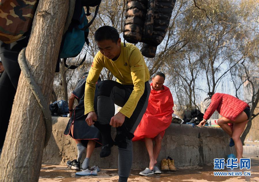 12月20日,冬泳愛好者在黃河中冬泳后在河邊換衣服。新華社記者馬寧攝