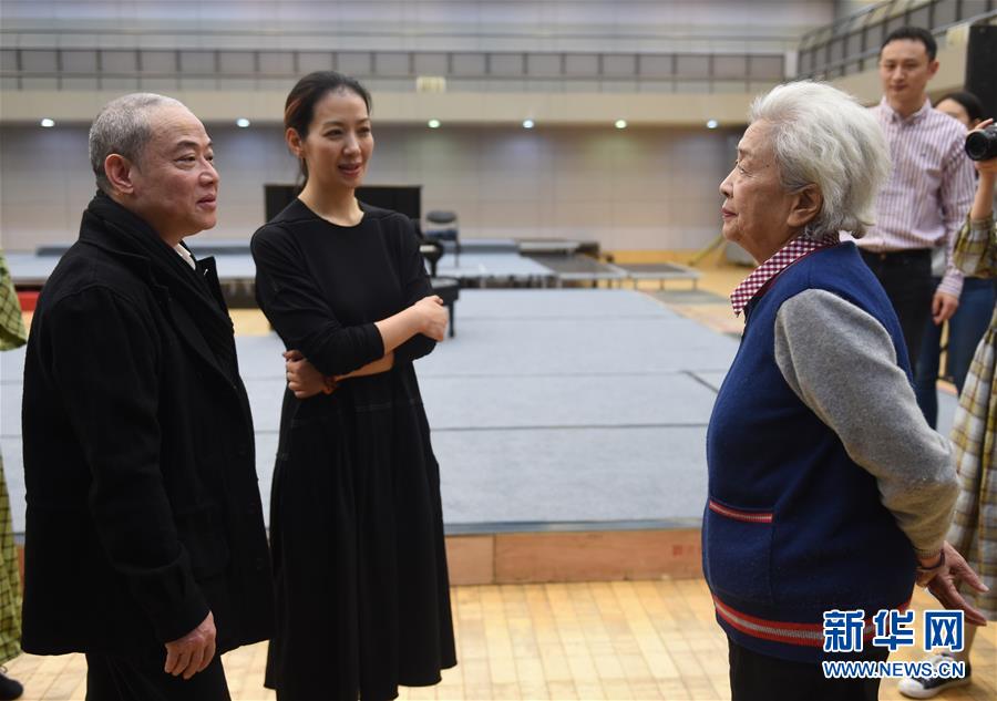 12月26日,電影《早春二月》中“陶嵐”的扮演者、老一代電影藝術(shù)家謝芳(右一)來到話劇《二月》探班現(xiàn)場,與李六乙導(dǎo)演(左一)和話劇《二月》中“陶嵐”的扮演者盧芳(左二)交流。 新華社記者 羅曉光 攝